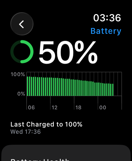 Sharing some info about Apple Watch Ultra 3’s battery life: it dropped by 50% over 34 hours (from Wed 5:36 pm to Fri 3:36 am), by 40% in 24 hours with AOD on (from Tue 4:03 am to Wed 4:27 am) and by 30% in 24 hours with AOD off (from Wed 5:36 pm to Thu 5:55 pm). It’s quite the powerhouse!